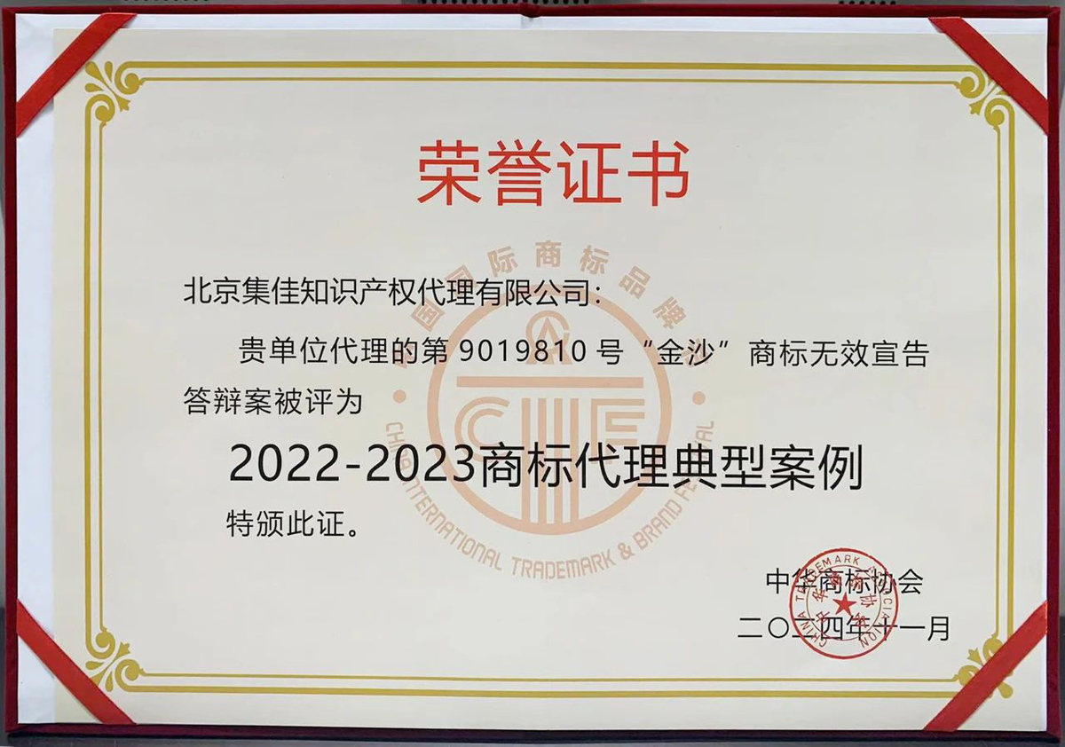 >jiuyou>关于我们>荣誉概览>2024>集佳代理的“金沙”商标权无效宣告答辩案入选“2022-2023商标代理典型案例”